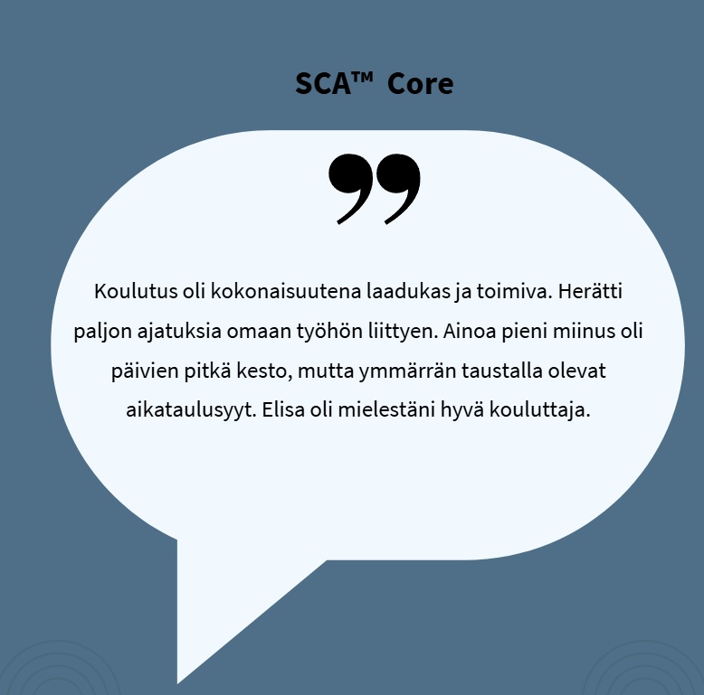 on 2-päiväinen koulutus kaikille terveydenhuollon ammattilaisille, joiden työhön oleellisesti liittyy asiakkaan kanssa toimiminen ja keskustelu. Koulutus keskittyy SCA™ tietotaidon haltuun ottoon käytännössä eli keinoihin tukea ja vahvistaa yhdessä toimimista ja keskusteluja.