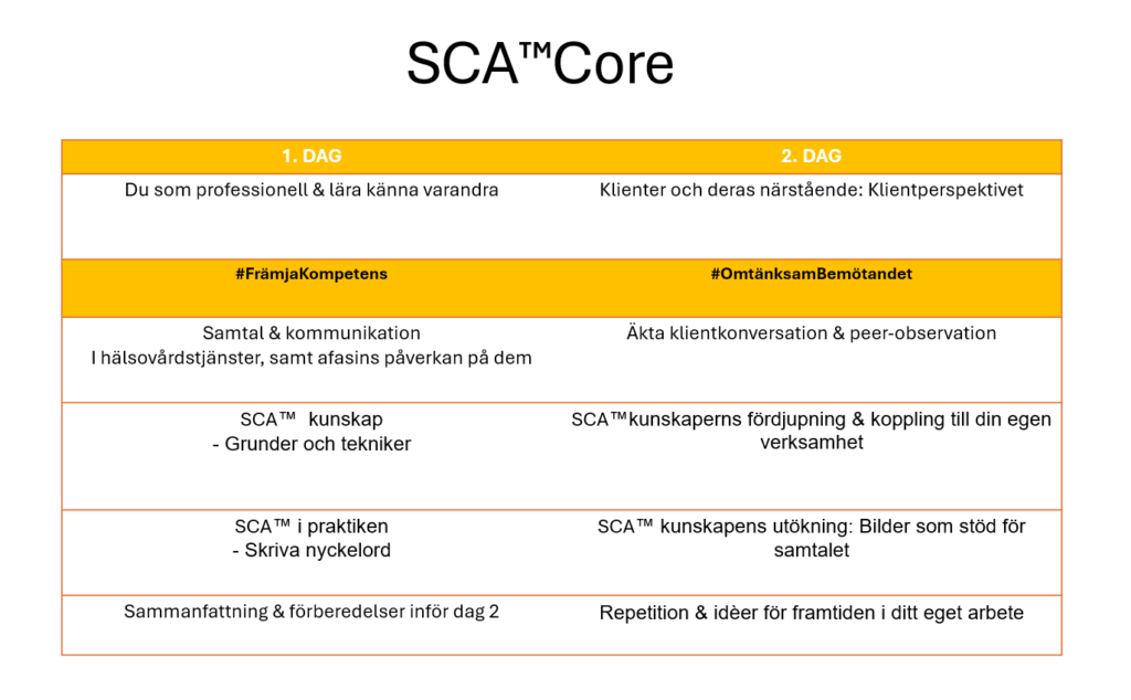 är en 2-dagars utbildning för vårdpersonal vars arbete fokuserar på kommunikation, kundsamtal och kommunikativt användarvänliga tjänster. Utbildningen fokuserar på att praktiskt behärska SCA™:s kunnande, det vill säga metoder för att stödja och stärka diskussioner.