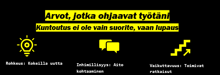Arvokkainta on se, mikä vaikuttaa arkeen. Keskityn ratkaisuihin, jotka tuottavat todellisia tuloksia. Näitä ovat niin kuntoutujille kuin kuntoutusta tuottaville ammattilaisille toivo ja motivaatio sekä luottamus omaan toimintakykyyn.